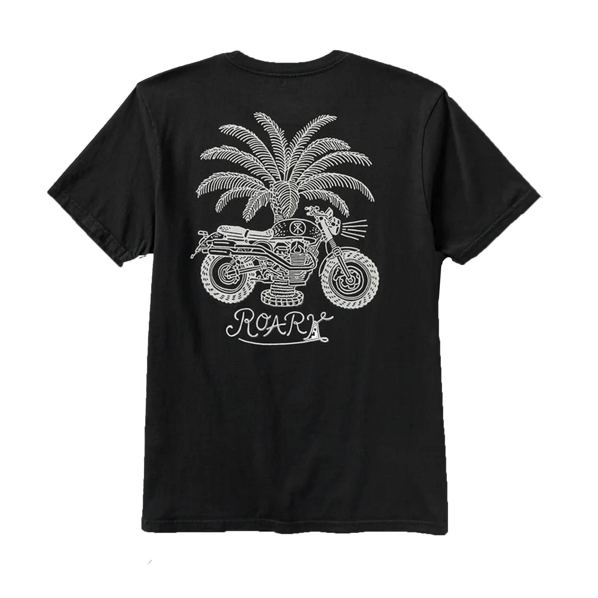 Hit the road with the spirit of adventure in the Moto graphic tee. This standard fit black short sleeve t-shirt features a subtle palm tree and Roark logo detail on the front, while the back showcases an intricately drawn motorcycle under a towering palm. Crafted from soft, durable cotton, this shirt is designed to keep up with your travels.